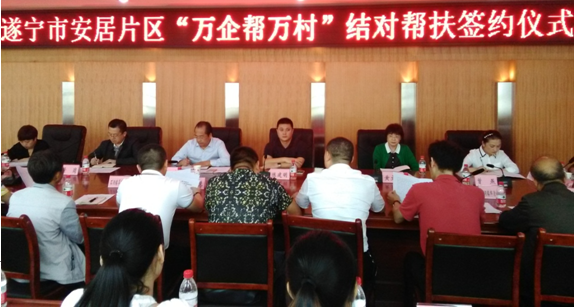 9月27日,遂宁市工商联副主席陈建明同志带领市工商联参与扶贫的爱心企业代表,赴安居举行安居片区“万企帮万村”结对帮扶签约仪式。仪式由安居区政协副主席、工商联主席邹斌同志主持。
