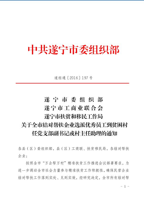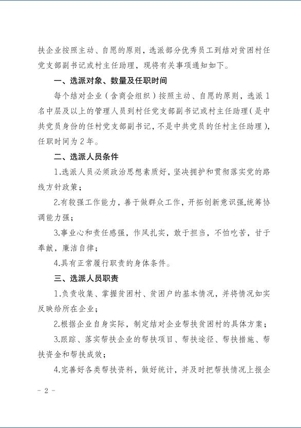 关于全市结对帮扶企业选派优秀员工到贫困村任党支部副书记或村主任助理的通知